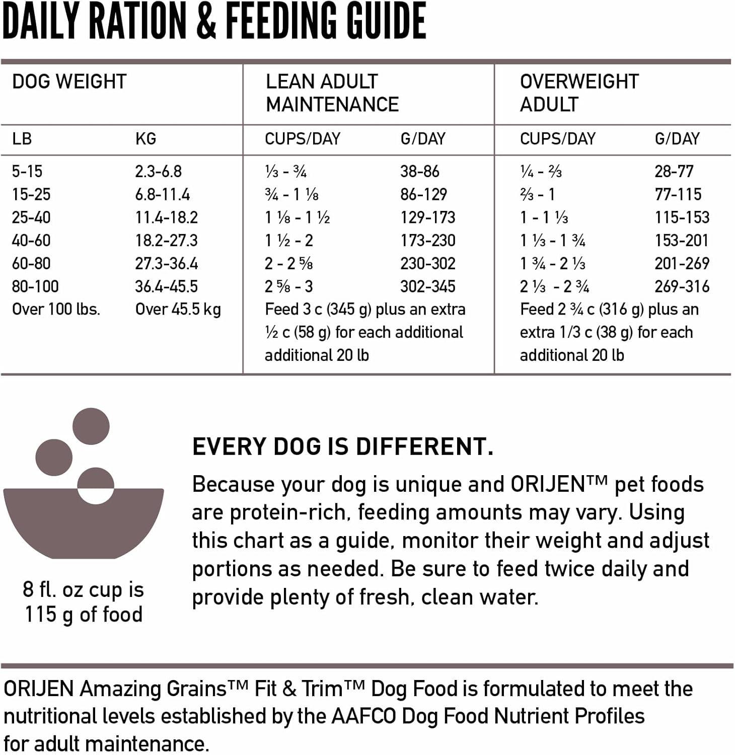 Light doesn’t mean less nourishing, and ORIJEN AMAZING GRAINS™ Fit & Trim dry dog food is packed with fresh or raw animal protein and enhanced with grains to give your dog peak nourishment. This unique recipe is specially formulated to help support weight management, including ideal body condition and lean muscle. Crafted with 85%* premium animal ingredients, ORIJEN AMAZING GRAINS™ Fit & Trim kibble includes WholePrey ingredients from free-run** chicken and wild-caught fish. This ORIJEN™ dry dog food also includes a high-quality blend of oats, quinoa and chia, hand-selected to provide a balanced fiber ratio that helps support your dog's digestive health. Nourish your dog completely with the amazing animal protein and quality grains found in ORIJEN AMAZING GRAINS™. *Approximate and derived from the unprocessed state of the ingredients. **Our free-run chickens and turkeys are not housed in cages and are able to move in a barn without outdoor access. Our fresh ingredients use refrigeration as the sole method of preservation and our raw ingredients are frozen at their peak freshness.