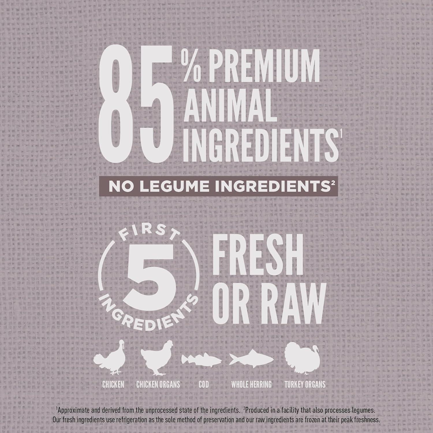 The first five ingredients are fresh or raw chicken, whole herring, whole mackerel, chicken liver and salmon with protein, vitamins and minerals