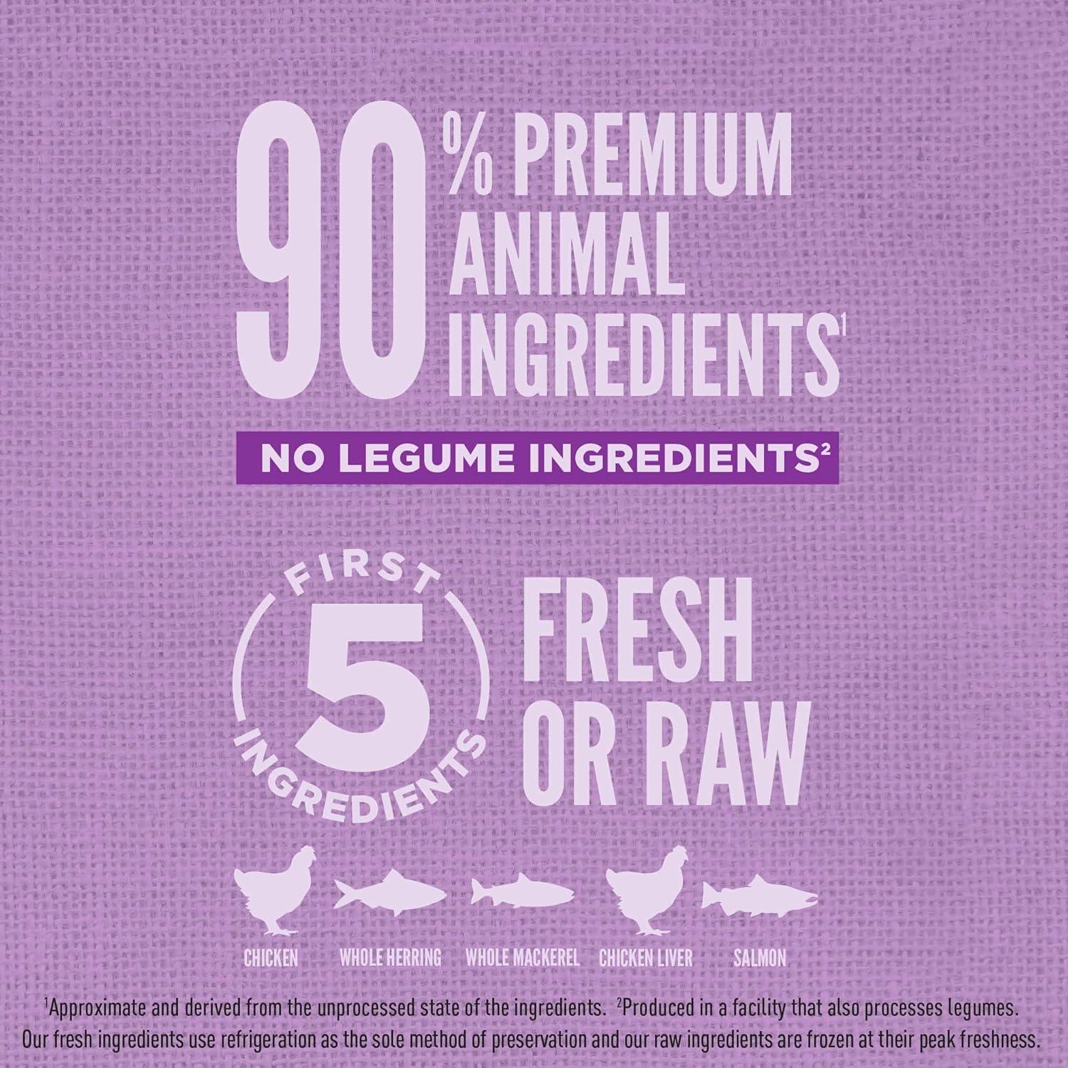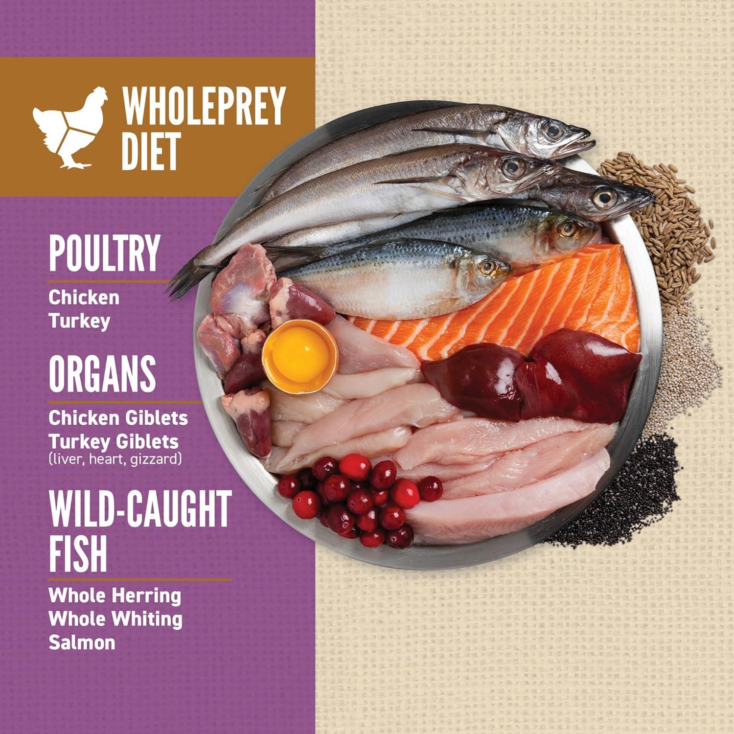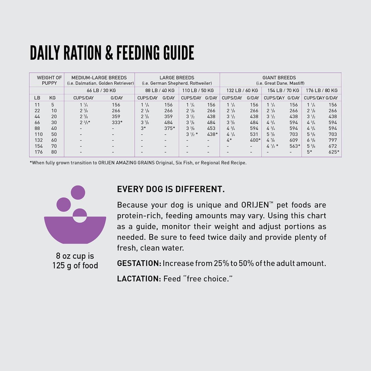 Support your large breed puppy’s rapid growth and development with ORIJEN AMAZING GRAINS Puppy Large Dry Dog Food. This large breed dog food kibble includes DHA and EPA from pollock oil to support healthy immune function. Each serving of this ORIJEN dog food for puppies contains omega 3-rich oil to support healthy skin and coat. It also supports your puppy’s digestive health with prebiotics, probiotics, fiber from inulin and a high-quality blend of oats, quinoa and chia. Made with 90% animal ingredients*, this high protein dog food supports muscle development and maintenance. The first five ingredients of this puppy dog food are fresh or raw chicken, whole herring, whole mackerel, chicken liver and salmon to provide a strong source of protein, vitamins and minerals. ORIJEN's authentic WholePrey diet features the most succulent and nutrient-rich parts of the prey. And the freeze dried coating provides a burst of flavor dogs instinctively crave. Our included fresh ingredients use refrigeration as the sole method of preservation and our included raw ingredients are frozen at their peak freshness. *Approximate 90%. Derived from the unprocessed state of the ingredients.