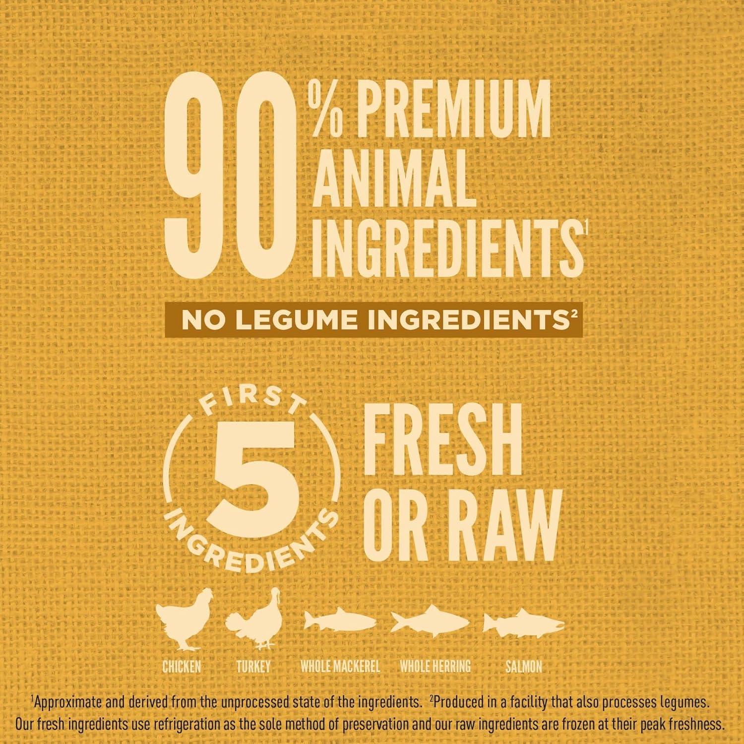 Nourish your puppy’s instincts and help it grow up strong with ORIJEN AMAZING GRAINS Puppy Dry Dog Food. Made with DHA and EPA from pollock oil, this dog food kibble includes antioxidant nutrients to support your puppy's immune health, while Omega 3-rich oil from wild-caught pollock helps your puppy's coat and skin stay shiny and healthy. This ORIJEN dog food for puppies also provides prebiotics, probiotics, fiber from inulin and a high-quality blend of oats, quinoa and chia for a balanced fiber ratio that helps support your puppy’s digestive health. The first five ingredients of this puppy dog food are fresh or raw chicken, turkey, whole herring, whole mackerel and salmon, giving your puppy a source of protein, vitamins and minerals. Made with 90% animal ingredients*, ORIJEN's authentic WholePrey diet features the most succulent and nutrient-rich parts of the prey and a freeze dried coating that provides a burst of flavor dogs instinctively crave. Our included fresh ingredients are delivered refrigerated and our included raw ingredients are delivered frozen. NOURISH AS NATURE INTENDED. *Approximate 90%. Derived from the unprocessed state of ingredients