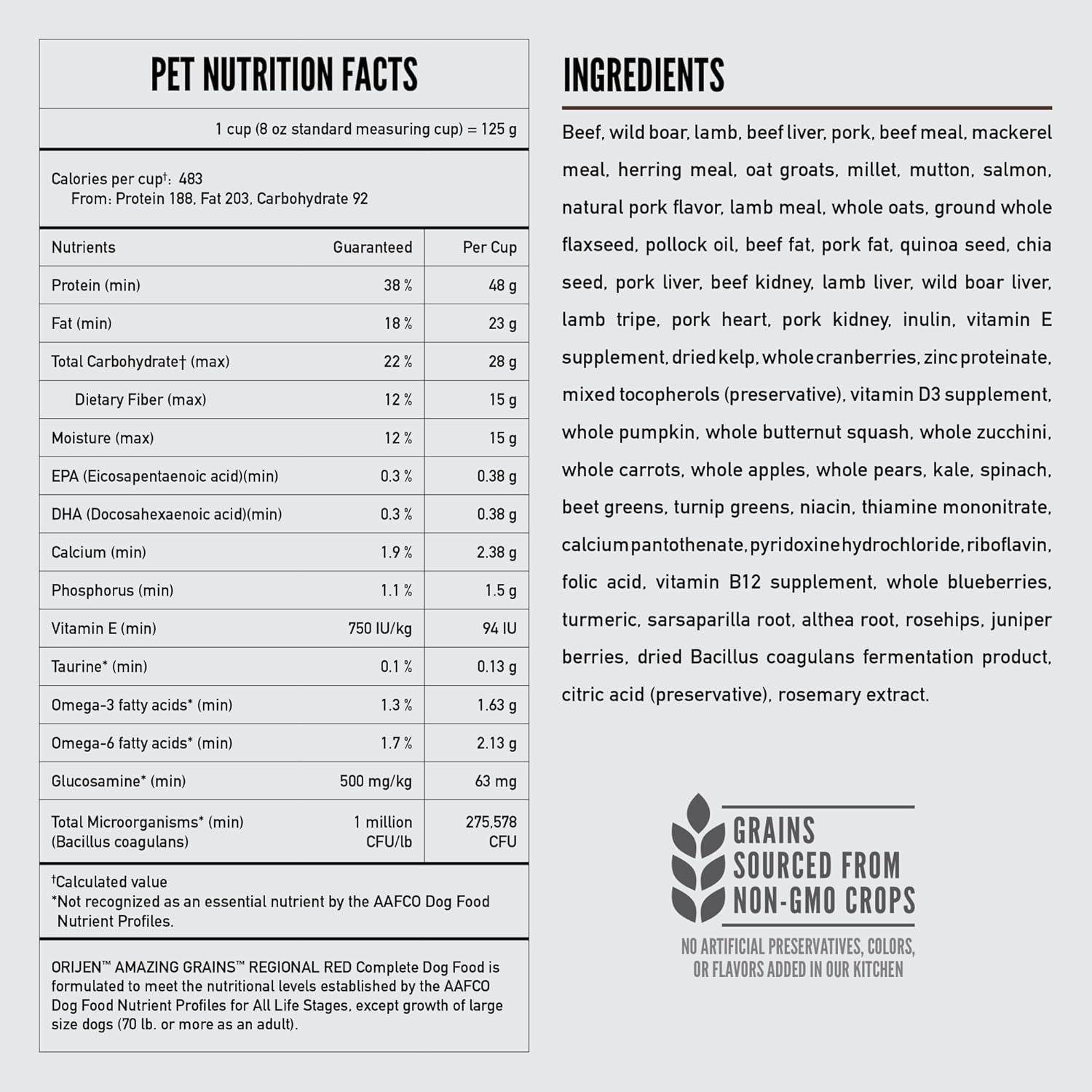 Help your dog thrive with the animal protein and hand-selected grains found in ORIJEN AMAZING GRAINS REGIONAL RED Dry Dog Food. Packed with DHA and EPA from pollock oil, this dog food kibble provides the antioxidant support your dog needs to maintain a healthy immune function. This ORIJEN dog food helps support healthy skin and coat with Omega-3 rich oil from wild-caught pollock and provides probiotics, prebiotics, fiber from inulin and a high-quality blend of oat groats, millet, whole oats, quinoa and chia to provide a balanced fiber ratio and support your dog’s digestive health. This high-protein dog food provides peak nutrition with 90% animal ingredients* to support muscle maintenance. The first five ingredients of this high-protein dog food are fresh or raw** beef, wild boar, lamb, beef liver and pork, giving your dog a strong source of essential protein, vitamins and minerals. Each serving offers ORIJEN WholePrey ingredients including organs to provide your dog with the most succulent and nutritious parts of the prey, and the freeze dried dog food coating provides a burst of flavor dogs instinctively crave. Our included fresh ingredients are delivered refrigerated and our included raw ingredients are delivered frozen. NOURISH AS NATURE INTENDED. *Approximate 90%. Derived from the unprocessed state of the ingredients. **Derived from the unprocessed state of the ingredients.