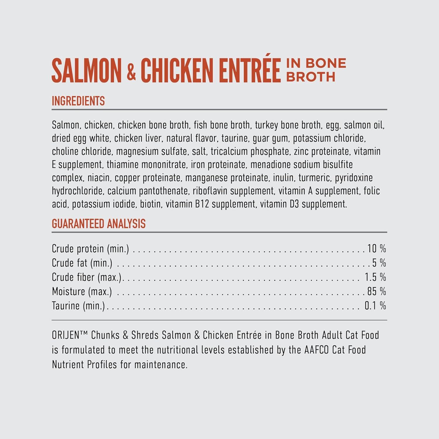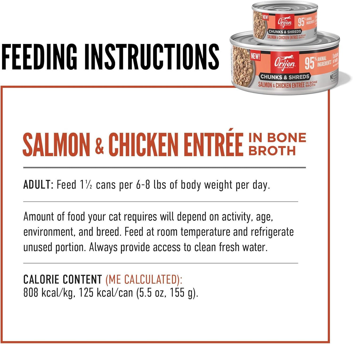 ORIJEN Chunks & Shreds Wet Cat Food Variety Pack: Original + Salmon & Chicken Entrées 3oz Cans (12 Count, 6 of Each)(Salmon & Chicken Entrée Chunks & Shreds)