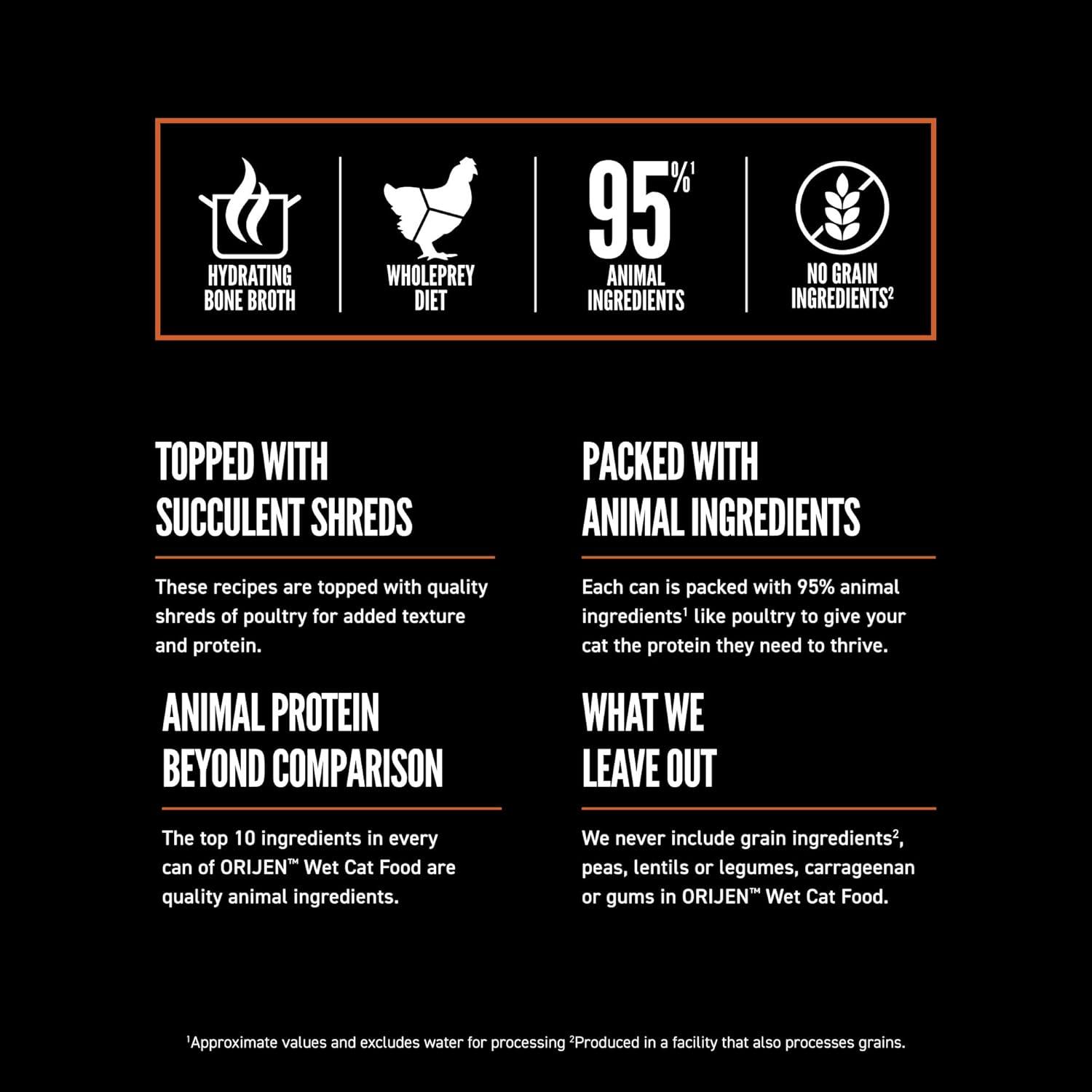 Nourish your cat completely with hearty WholePrey animal ingredients and real shreds of meat, poultry or fish in ORIJEN™ Chunks & Shreds Wet Cat Food! Cats are obligate carnivores, so they thrive off a diet packed with animal ingredients. That’s why our Regional Red Entrée recipe includes a whopping 95% animal ingredients*, including lamb and tuna, to provide your cat with the Biologically Appropriate nourishment they were born to eat. This diet also includes succulent WholePrey ingredients like lamb kidney to provide your cat with rich and varied nutrients. Bone broth helps support your cat’s hydration, while also adding tempting flavor. Nourish your cat with the texture and variety of raw animal ingredients packed into every can of ORIJEN™ Chunks & Shreds. *exclusive of water. **Produced in a facility that also processes grains. Our included raw ingredients are delivered frozen.