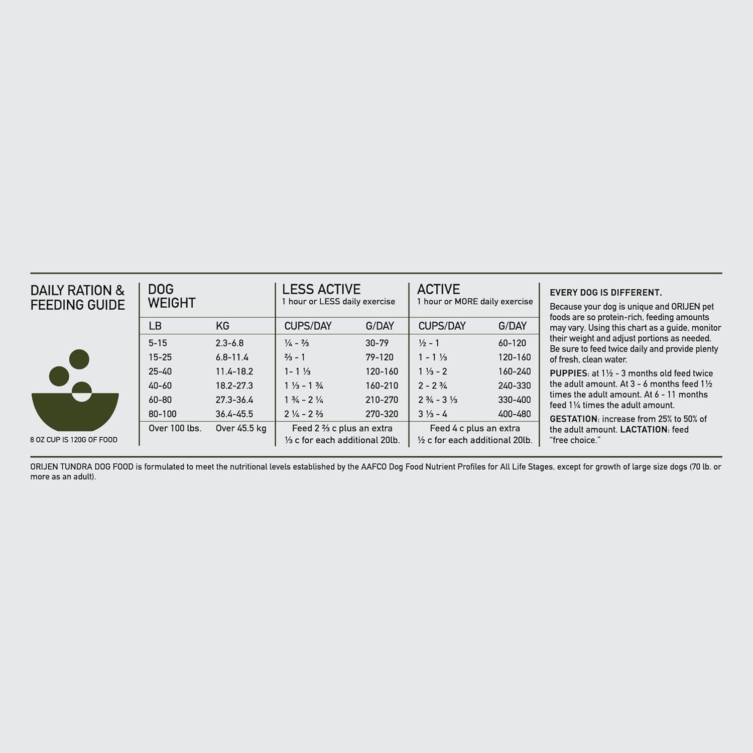 The first five ingredients of each ORIJEN Dog Food recipe are always fresh or raw animal sources and coated with freeze-dried liver. Our Tundra recipe is formulated with 85 percent (approximate and derived from the unprocessed state of the ingredients) premium animal ingredients like lamb, venison, duck, whole arctic char and pilchard. We believe eating a wholeprey diet is key to supporting your dog's overall health by including the most nutrient-dense and succulent parts of the prey in their diet. All of our fresh ingredients use refrigeration as the sole method of preservation and our raw ingredients are frozen at their peak freshness to ensure quality in every bag of ORIJEN Dog Food.