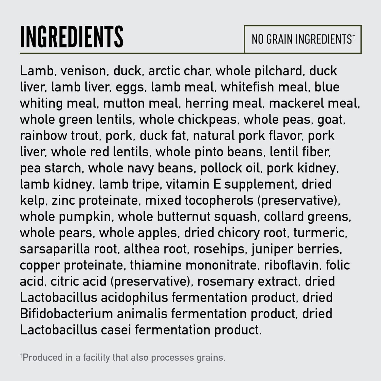 Nutrient-Dense Recipe: Packed with high-protein animal ingredients like lamb, venison, duck, whole arctic char and pilchard.