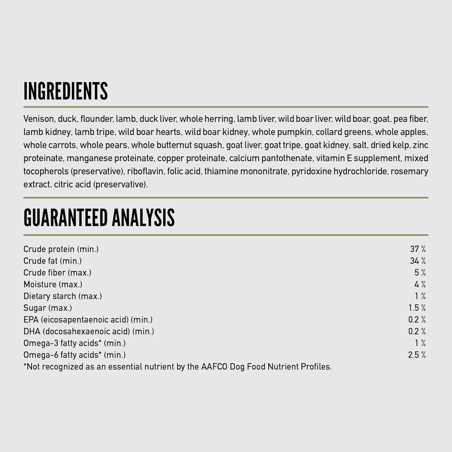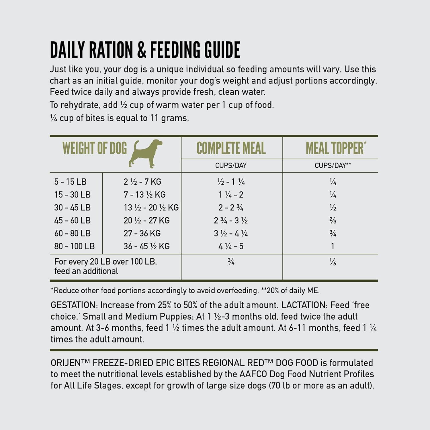 ORIJEN™ Freeze-Dried Epic Bites dry dog food is nourishing freeze-dried dog food made with 90% raw animal ingredients* including venison, duck, wild-caught flounder, lamb and wild boar. ORIJEN Epic Bites dog food can be fed as a nourishing topper on their favorite ORIJEN dry dog food, as a standalone meal rich with nutrients and flavor, or as rewarding treats. As a dog food topper, these ORIJEN WholePrey bites add flavor, texture and raw animal ingredients to their favorite ORIJEN dog food kibble. Give your dog real, raw nourishment conveniently freeze-dried with ORIJEN Epic Bites freeze dried dog food. *Approximate and derived from the unprocessed state of the ingredients. Our included raw ingredients are delivered frozen.