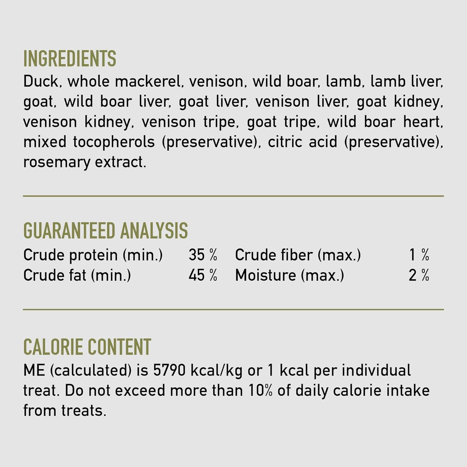 ORIJEN cat treats contain WholePrey animal ingredients to provide nutrition from the most nutrient-dense and succulent parts of the prey
