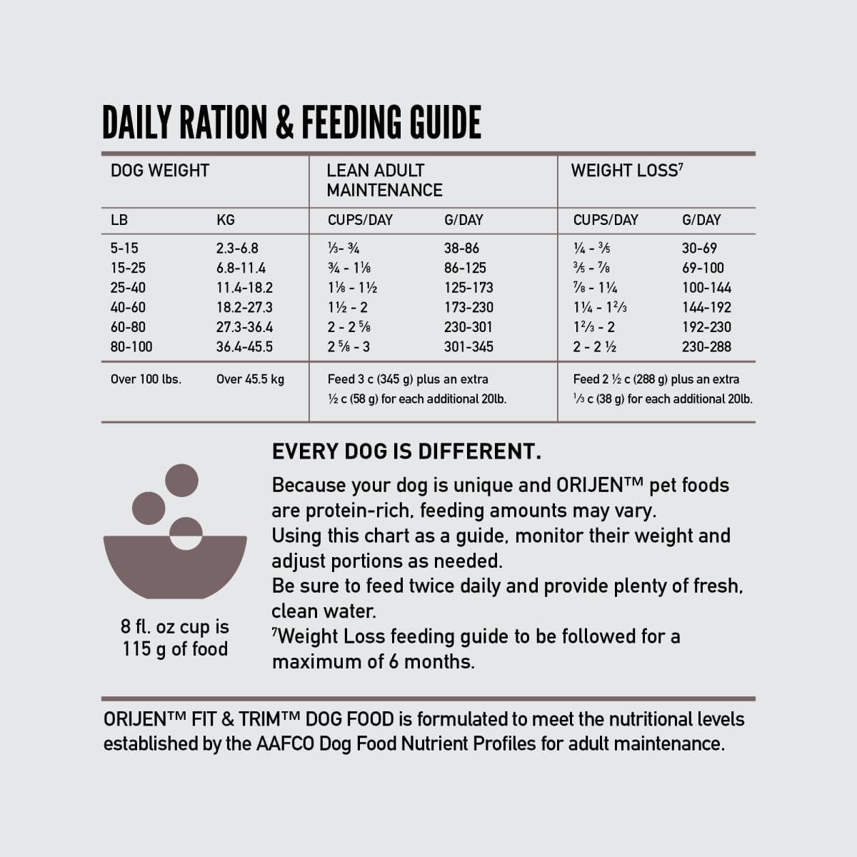 Help your dog thrive with the power of protein-rich ORIJEN Fit and Trim Dry Dog Food. This ORIJEN grain free* dry dog food is optimized to support lean muscle mass and is specifically designed to support peak physical conditioning. With a Biologically Appropriate recipe, this grain free* dog food kibble is based on what your canine's ancestors consumed in the wild. Containing 85 percent** animal ingredients, ORIJEN dog food provides a high protein diet that will nourish a lifetime of adventures. The first five ingredients of this high protein dog food are fresh or raw poultry and fish ingredients, including chicken, chicken liver, turkey giblets, turkey, and cod, giving your dog a strong source of protein, vitamins and minerals. ORIJEN WholePrey ingredients including nourishing organs provide your dog with the most succulent and nutrient-rich parts of prey, and the freeze dried coating provides a burst of flavor dogs instinctively crave. Our included fresh ingredients are delivered refrigerated and our included raw ingredients are delivered frozen. NOURISH AS NATURE INTENDED. *Produced in a facility that also processes grains **Approximate 85%. Derived from unprocessed state of the ingredients.