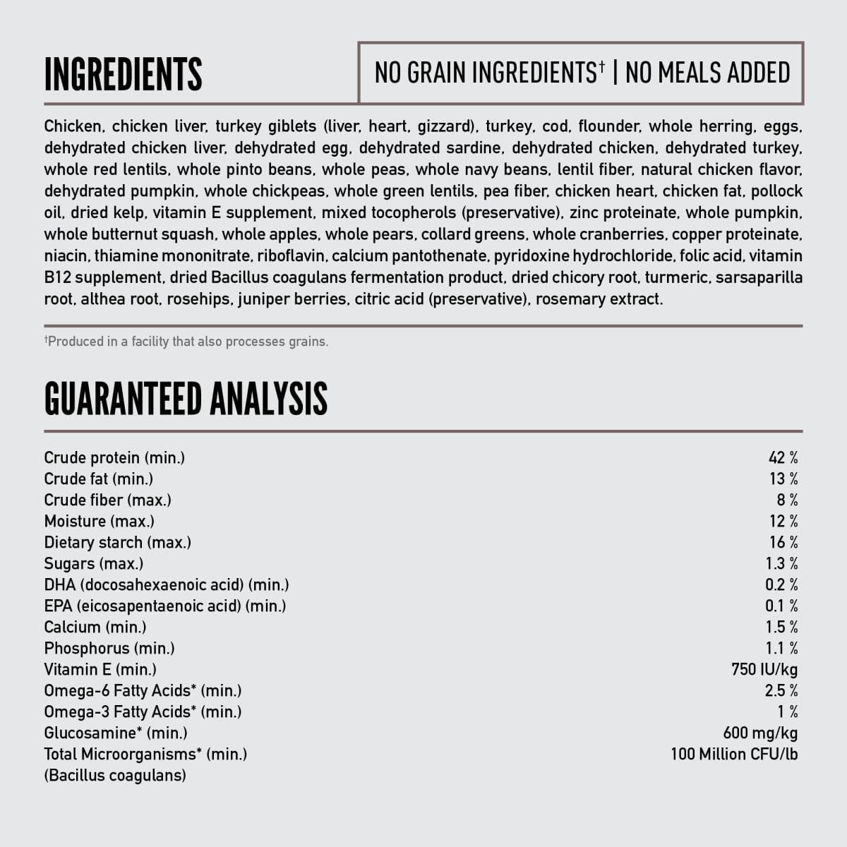 Grain free* dog food containing 85 percent** animal ingredients, including WholePrey ingredients like nourishing organs to mimic what your dog's ancestors consumed in the wild