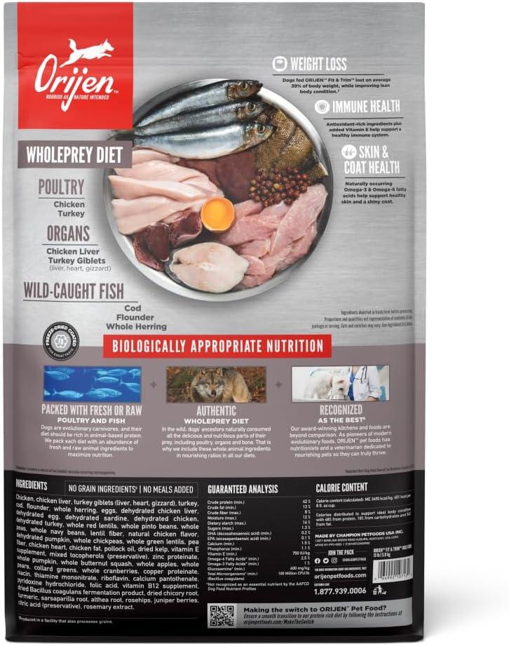 ORIJEN Grain Free High Protein Dry Dog Food Fit & Trim Recipe 13lb Bag(Original Recipe)