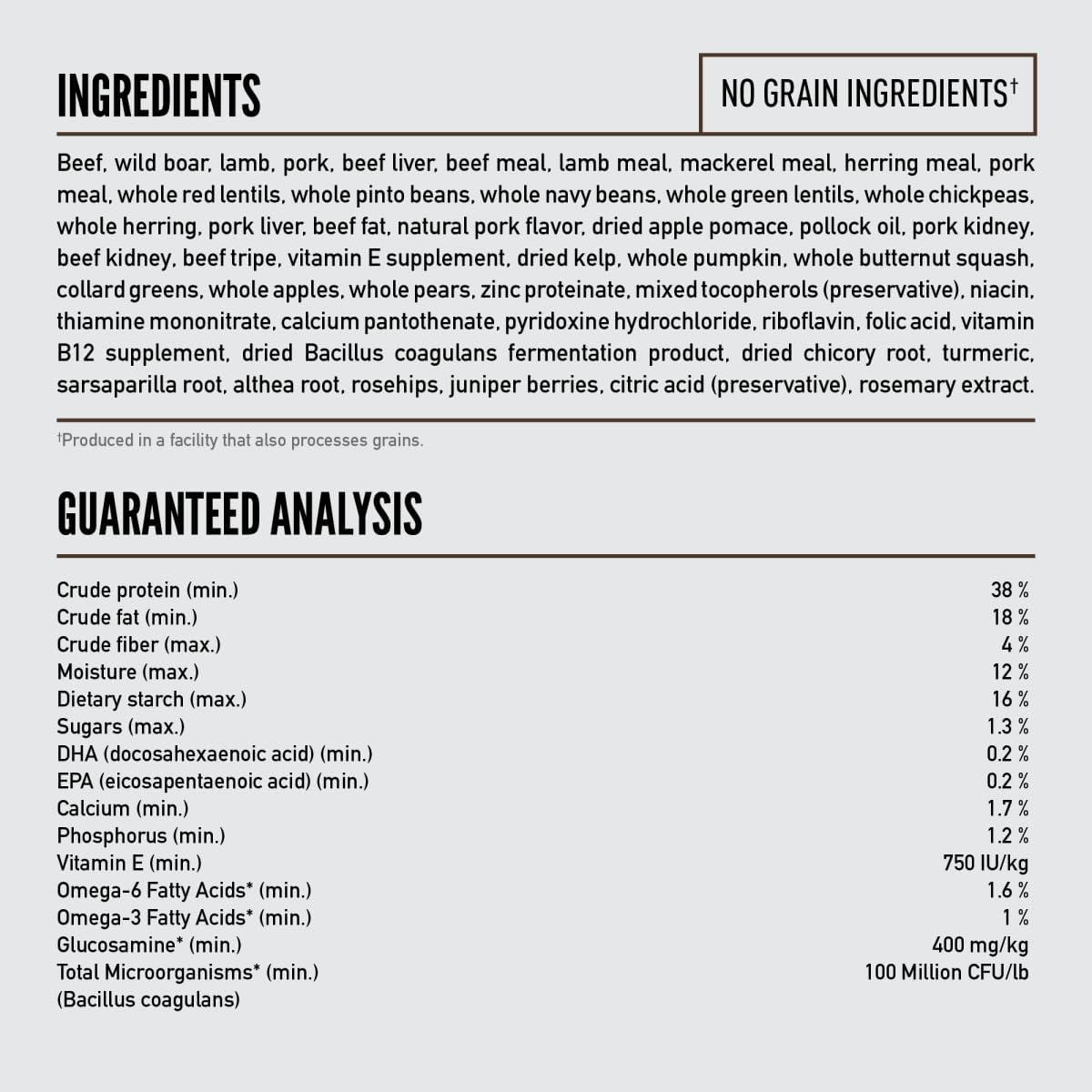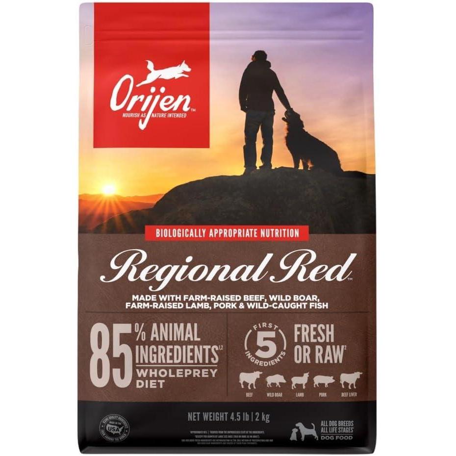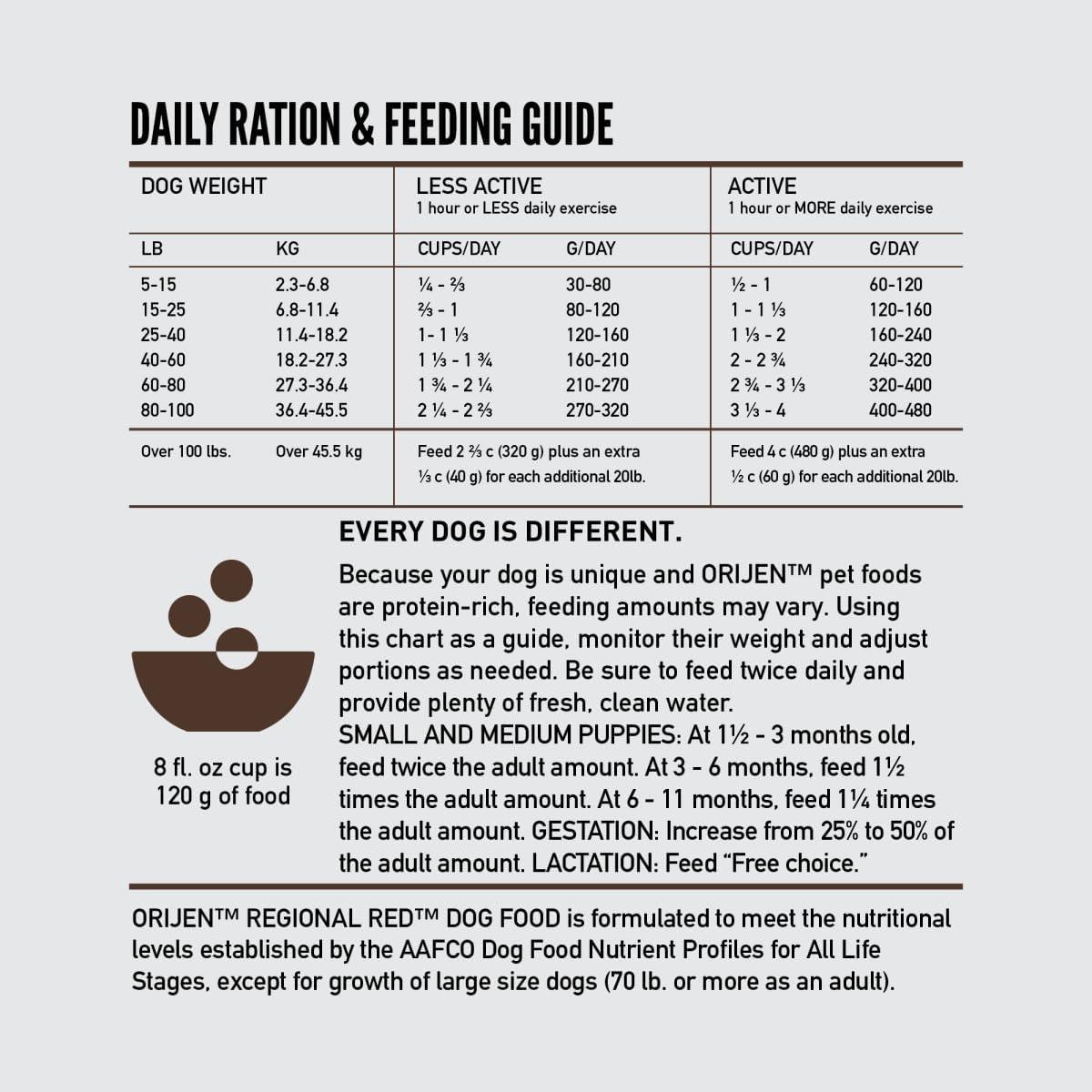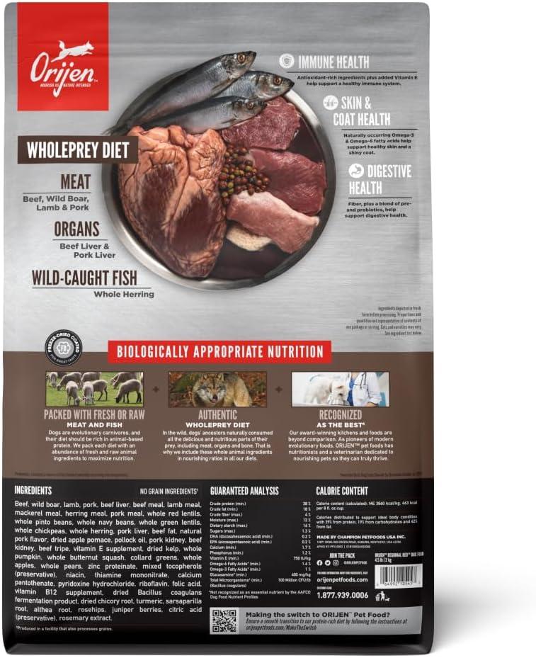 Help your dog thrive with the power of protein-rich ORIJEN Fit and Trim Dry Dog Food. This ORIJEN grain free* dry dog food is optimized to support lean muscle mass and is specifically designed to support peak physical conditioning. With a Biologically Appropriate recipe, this grain free* dog food kibble is based on what your canine's ancestors consumed in the wild. Containing 85 percent** animal ingredients, ORIJEN dog food provides a high protein diet that will nourish a lifetime of adventures. The first five ingredients of this high protein dog food are fresh or raw poultry and fish ingredients, including chicken, chicken liver, turkey giblets, turkey, and cod, giving your dog a strong source of protein, vitamins and minerals. ORIJEN WholePrey ingredients including nourishing organs provide your dog with the most succulent and nutrient-rich parts of prey, and the freeze dried coating provides a burst of flavor dogs instinctively crave. Our included fresh ingredients are delivered refrigerated and our included raw ingredients are delivered frozen. NOURISH AS NATURE INTENDED. *Produced in a facility that also processes grains **Approximate 85%. Derived from unprocessed state of the ingredients.