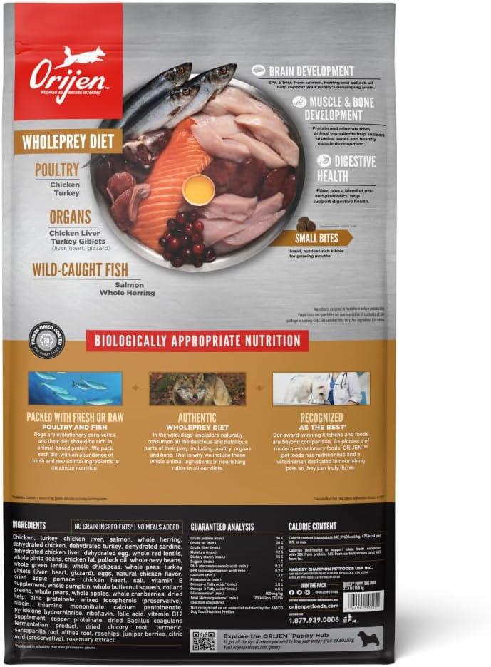 Help your puppy develop into a healthy and happy dog with the protein-powered nutrition found in ORIJEN Puppy Dry Dog Food. This grain free* dog food for puppies is packed with virtually every nutrient your puppy needs to thrive and provides a rich source of minerals that your puppy’s body can easily absorb, providing the peak nutrition your growing puppy needs every day. This high protein dog food is made with 85 percent animal ingredients** like free-run chicken, free-run turkey and wild-caught fish to support peak development. The first five ingredients of this puppy dog food are fresh or raw chicken, turkey, chicken liver, salmon and whole herring, giving your puppy a strong source of essential protein, vitamins and minerals to maximize their nutrition. ORIJEN's authentic WholePrey diet features the most succulent and nutrient-rich parts of the prey. The freeze dried dog food coating provides a burst of flavor dogs instinctively crave. Our included fresh ingredients are delivered refrigerated and our included raw ingredients are delivered frozen. NOURISH AS NATURE INTENDED. *Produced in a facility that also processes grains **Approximate 85 percent. Derived from the unprocessed state of the ingredients