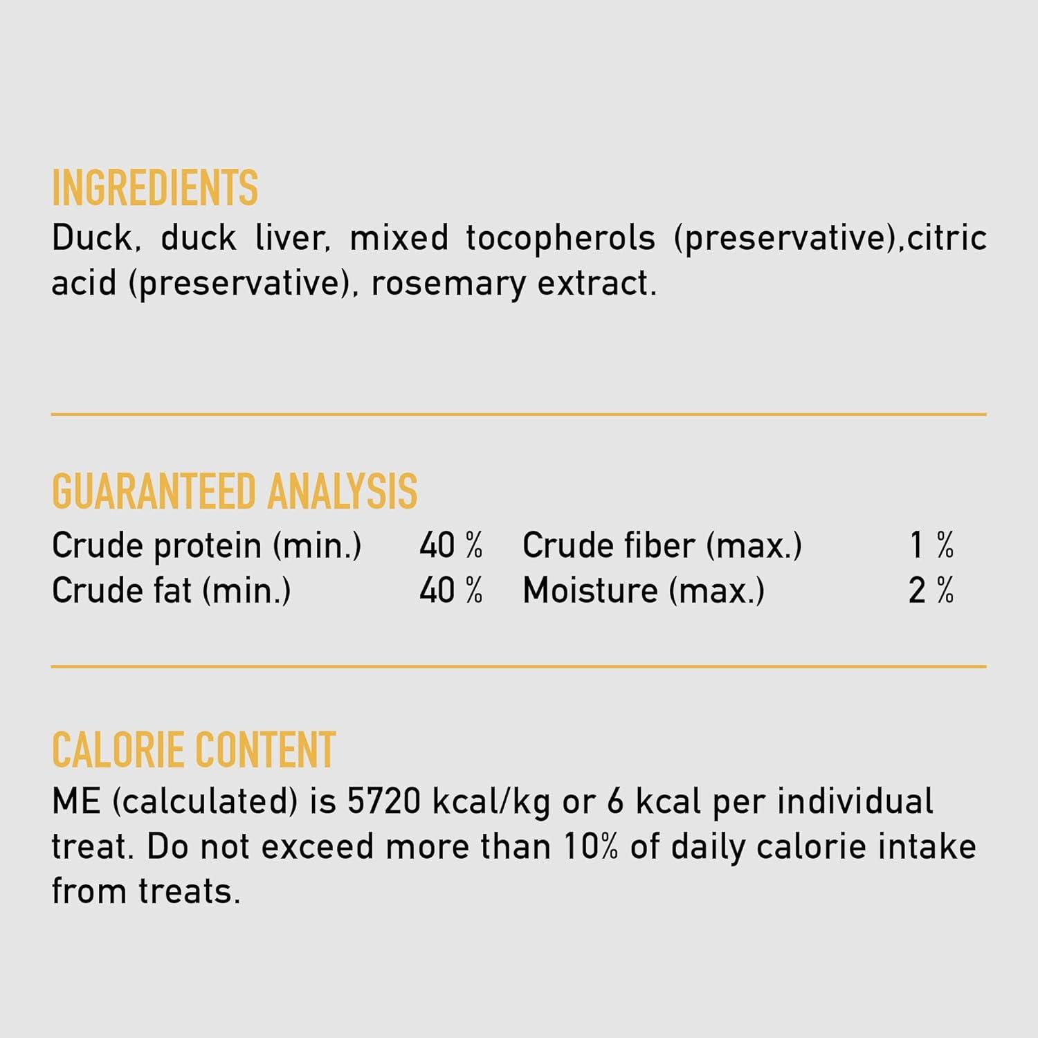 Treat your dog with delicious and nutritious ORIJEN Freeze Dried Duck Recipe Dog Treats. These ORIJEN dog treats are freeze dried to lock in the rich nutrients and taste, making them packable and perfect for adventures. At just 6 calories each, these treats are loaded with protein and amazing flavor. Containing 99 percent animal ingredients*, ORIJEN dog treats provide a high protein option for training or rewarding your dog. These high protein dog treats are made with high-quality animal ingredients, including duck and liver, giving your dog a strong source of protein, vitamins and minerals. NOURISH AS NATURE INTENDED. *Approximate and derived from the unprocessed state of the ingredients.