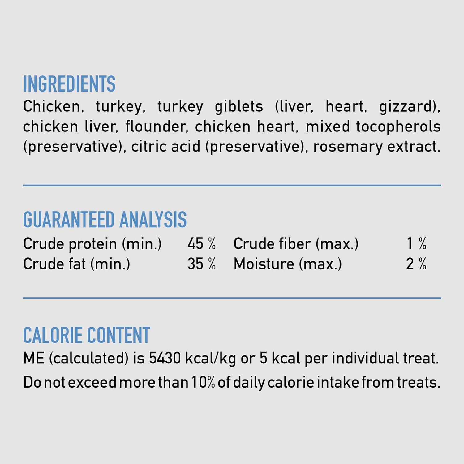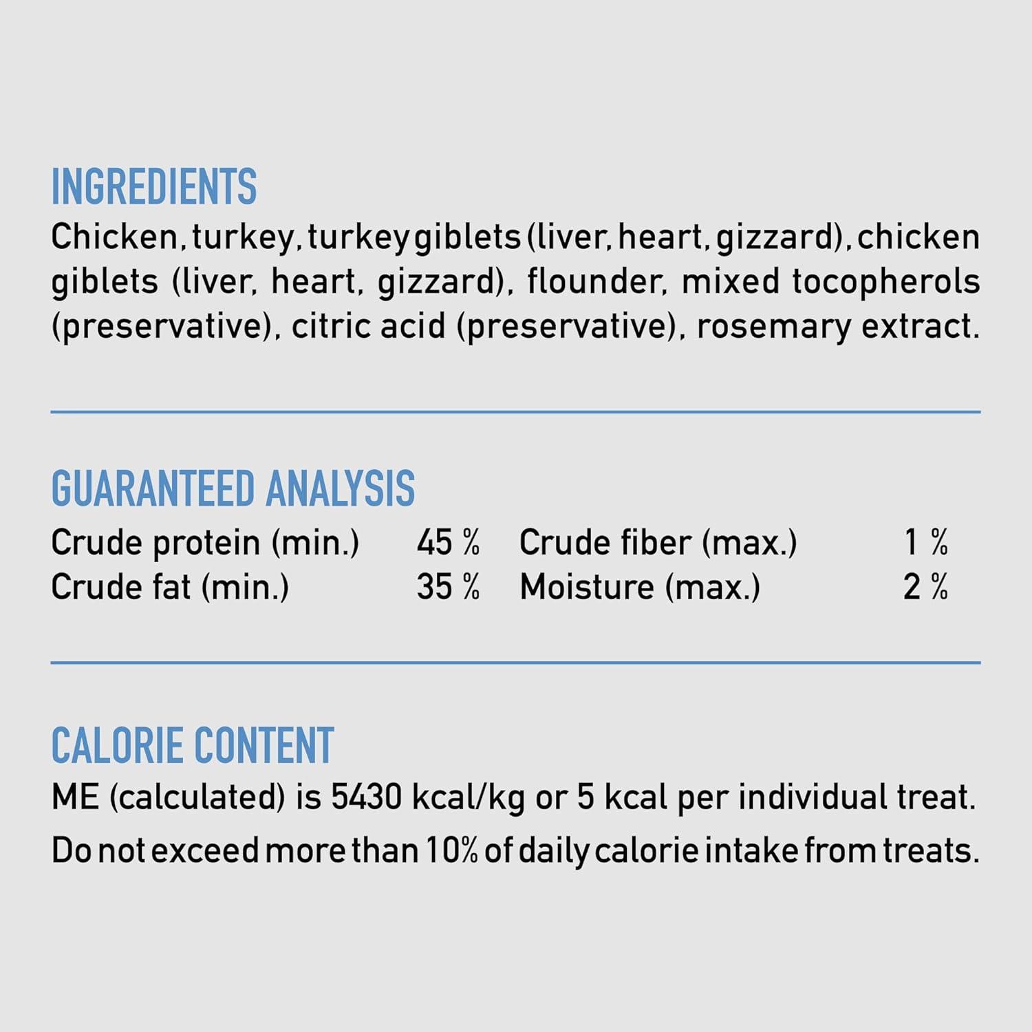 Treat your dog with delicious and nutritious ORIJEN Freeze Dried Original Dog Treats. These ORIJEN dog treats are freeze dried to lock in the rich nutrients and taste, making them packable and perfect for adventures. At just 5 calories each, these treats are loaded with protein and amazing flavor. Containing 99 percent animal ingredients*, ORIJEN dog treats provide a high protein option for training or rewarding your dog. These high protein dog treats are made with high-quality animal ingredients, including free run** poultry and wild-caught flounder, giving your dog an amazing taste. ORIJEN WholePrey ingredients including nourishing organs provide your dog with the most succulent and nutrient-rich parts of prey. *Approximate and derived from the unprocessed state of the ingredients. **Our free-run chickens and turkeys are not housed in cages and are able to move in a barn without outdoor access.