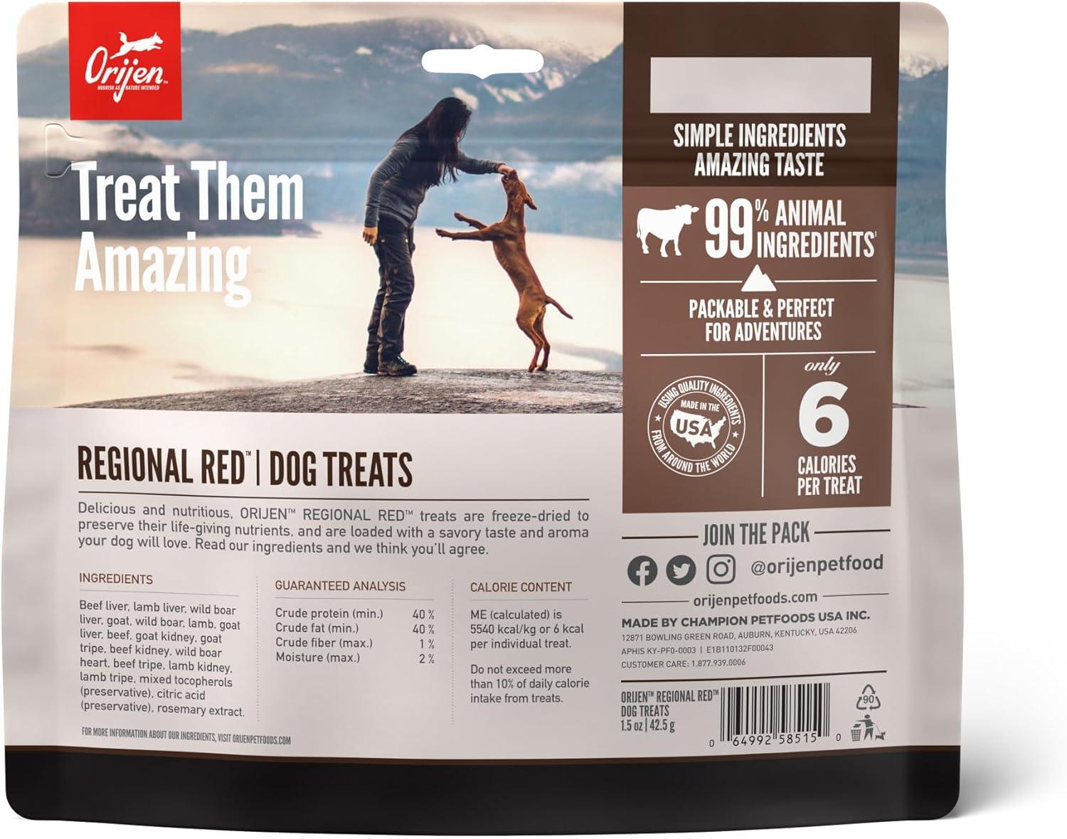 Treat your dog with delicious and nutritious ORIJEN Freeze Dried REGIONAL RED Dog Treats. These ORIJEN dog treats are freeze dried to lock in the rich nutrients and taste, making them packable and perfect for adventures. At just 6 calories each, these treats are loaded with protein and amazing flavor. Containing 99 percent animal ingredients*, ORIJEN dog treats provide a high protein option for training or rewarding your dog. These high protein dog treats are made with high-quality animal ingredients, including beef liver, goat, wild boar and lamb, giving your dog an amazing taste! ORIJEN WholePrey ingredients including nourishing organs provide your dog with the most succulent and nutrient-rich parts of prey. *Approximate and derived from the unprocessed state of the ingredients.