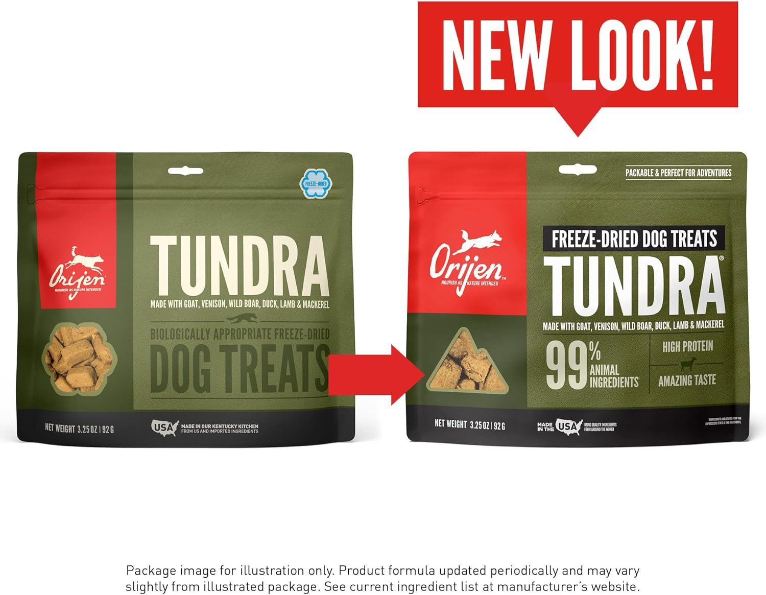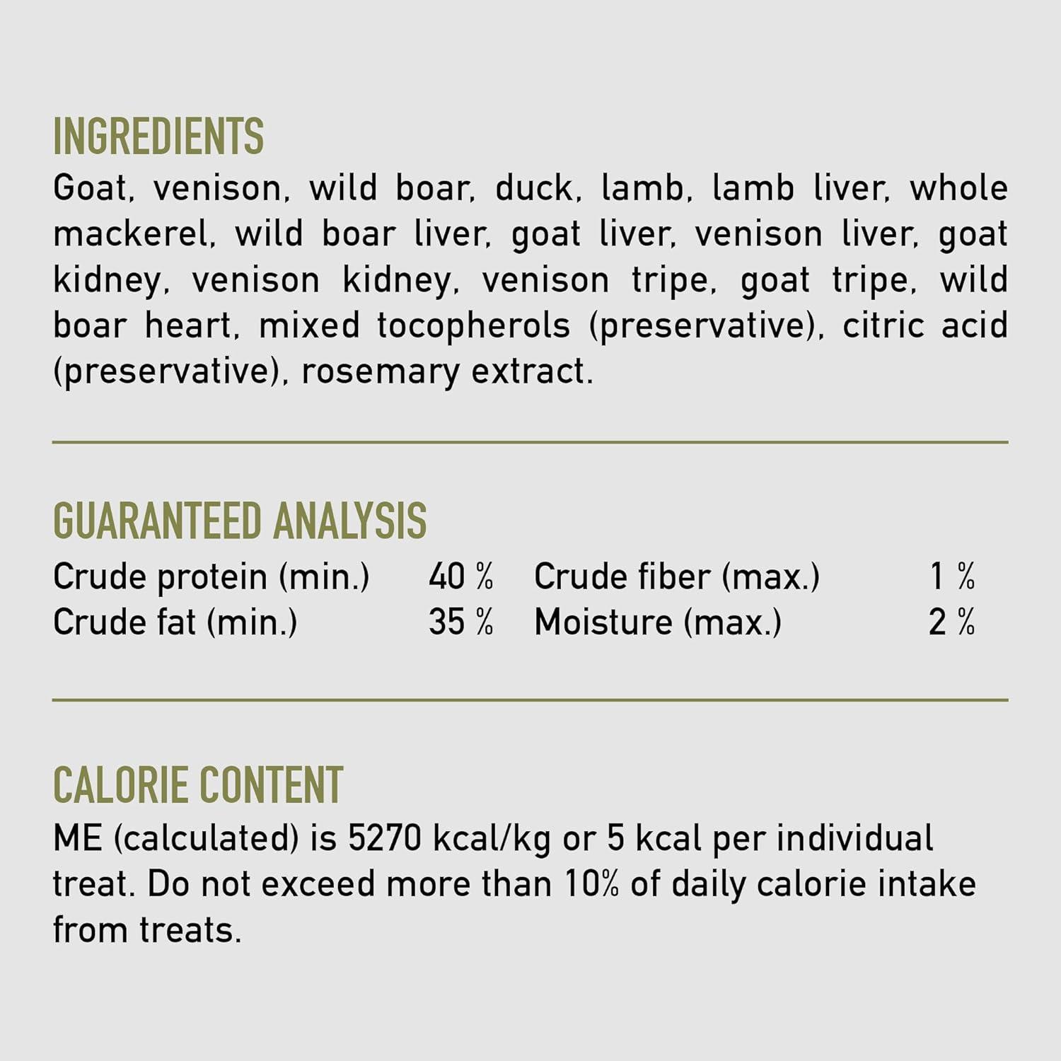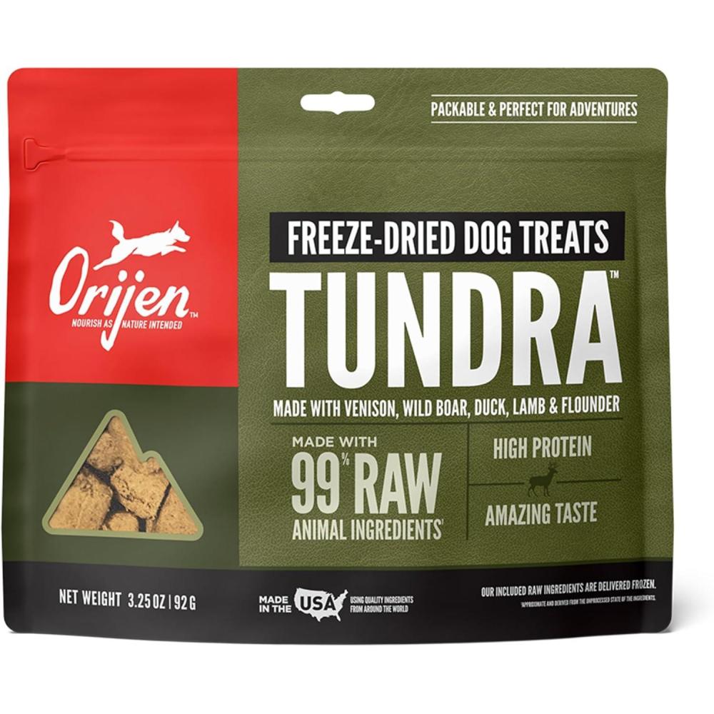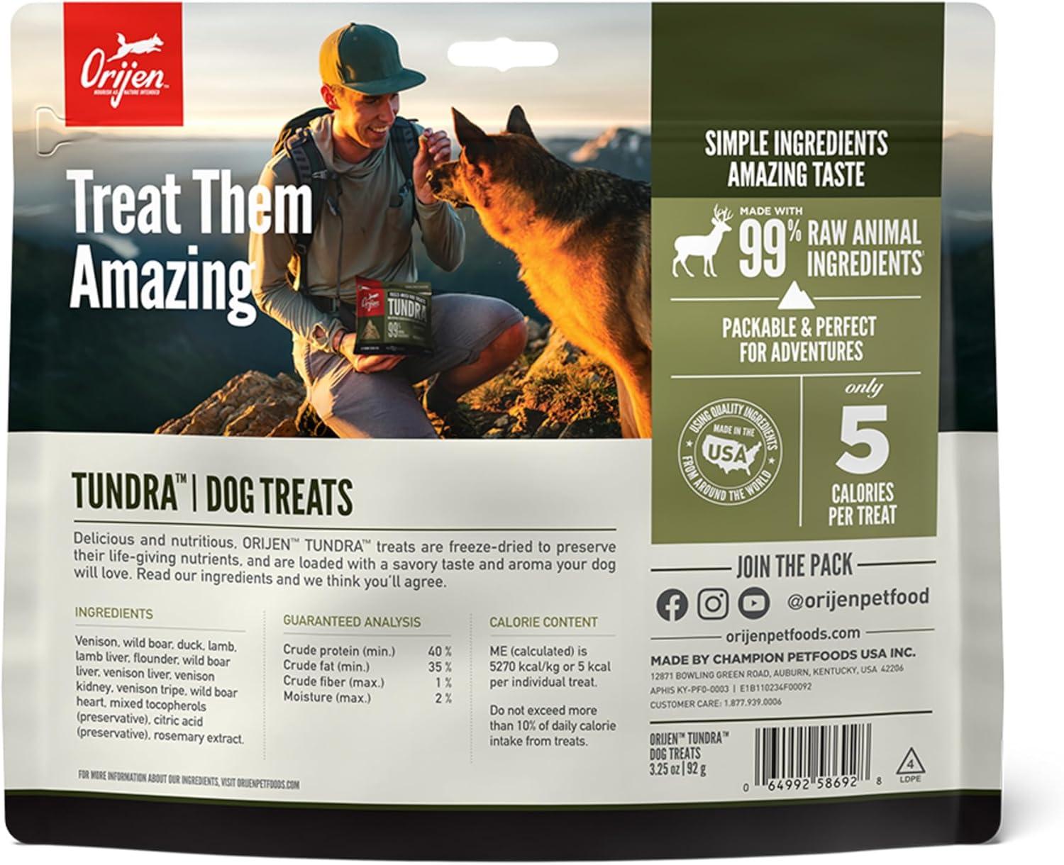 Treat your dog with delicious and nutritious ORIJEN Freeze Dried TUNDRA Dog Treats. These ORIJEN dog treats are freeze dried to lock in the rich nutrients and taste, making them packable and perfect for adventures. At just 5 calories each, these treats are loaded with protein and amazing flavor. Containing 99 percent animal ingredients*, ORIJEN dog treats provide a high protein option for training or rewarding your dog. These high protein dog treats are made with high-quality animal ingredients, including goat, venison, wild boar, duck, lamb and mackerel, giving your dog an amazing taste! ORIJEN WholePrey ingredients including nourishing organs provide your dog with the most succulent and nutrient-rich parts of prey. *Approximate and derived from the unprocessed state of the ingredients.