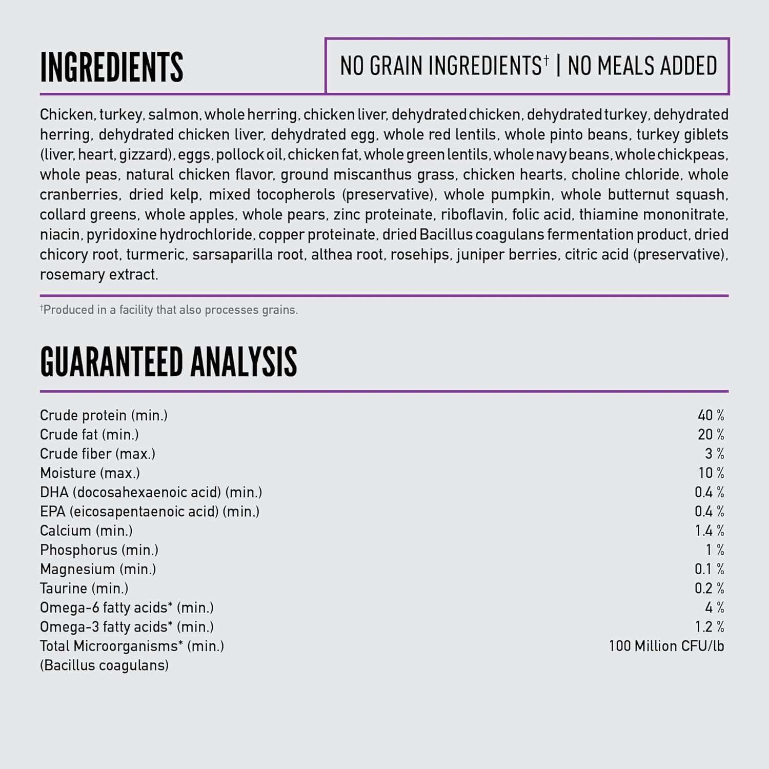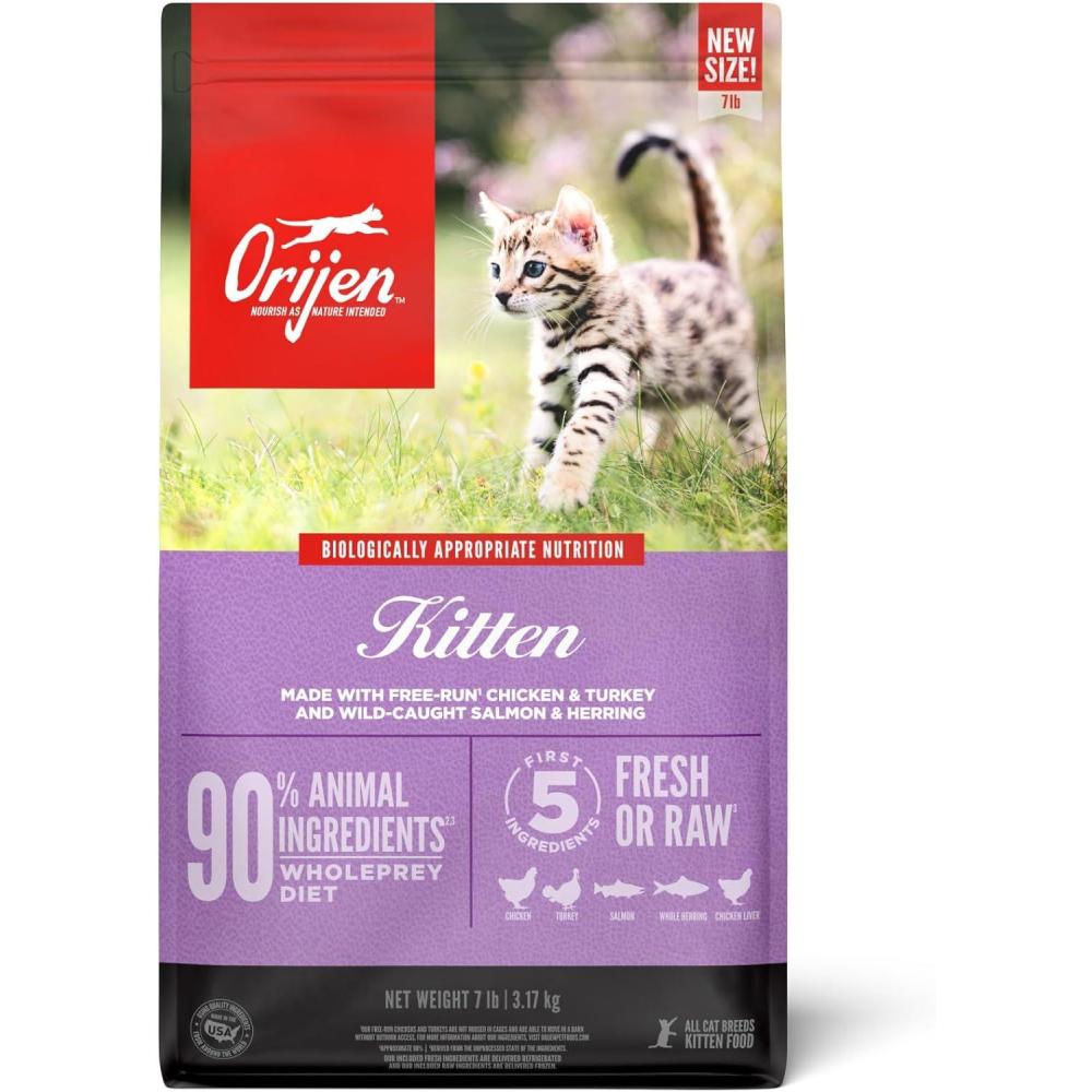 Help your adult cat thrive with the power of protein-rich ORIJEN GUARDIAN 8 Dry Cat Food with Fresh and Raw* Animal Ingredients. This ORIJEN cat food diet is made specifically to address eight common cat issues through quality ingredients. With a Biologically Appropriate recipe, this grain free** dry cat food is evocative of what your feline's ancestors consumed in the wild. Containing 90 percent*** animal ingredients, including 16 fresh or raw* ingredients, this ORIJEN cat food kibble provides a high protein diet and means less supplementation is needed to support your cat's health for a lifetime. The first five ingredients of this high protein cat food are fresh or raw* poultry or fish ingredients, including chicken, wild-caught salmon and rabbit. Responsibly farmed pollock oil offers increased levels of Omega 3s, EPA and DHA. The nutritious ingredients in this cat food help support the following: immune support, digestive health support, healthy skin and coat support, muscle maintenance, heart health, joint health, brain and cognitive function and eye health. ORIJEN WholePrey ingredients from organs and bones provide your cat with the most succulent and nutrient-rich parts of prey, and the freeze-dried liver coating provides a burst of flavor cats instinctively crave. NOURISH AS NATURE INTENDED. *Our included fresh ingredients are delivered refrigerated and our included raw ingredients are delivered frozen **No added grain ingredients. Produced in a facility that also processes grains ***Approximate and derived from the unprocessed state of the ingredients