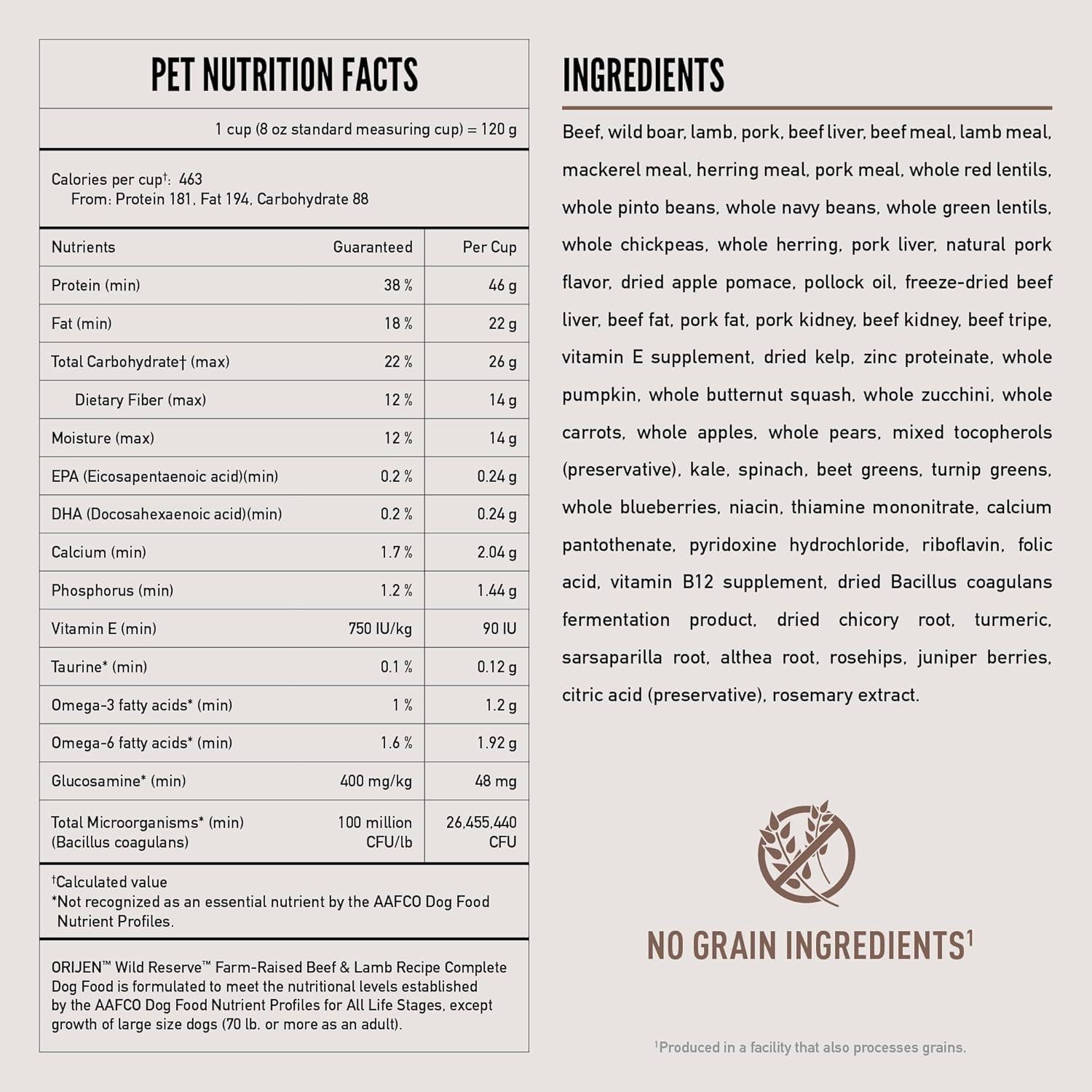 Make every meal enjoyable for your dog with dry dog food full of ingredients that help them thrive in ORIJEN WILD RESERVE Farm-Raised Beef & Lamb recipe. The first 5 ingredients* in this protein-packed kibble are fresh or raw meat and it is elevated with 100% beef liver morsels, freeze-dried to preserve flavor and nutrition for your dog. These freeze-dried beef liver inclusions add flavor to every bite, introduce variety and texture, and help provide excitement at mealtime. This ORIJEN Biologically Appropriate dry dog food recipe features nutrient-dense WholePrey animal ingredients and helps support your dog’s Immune System, Skin and Coat, and Digestive Health. Nourish your dog completely with ORIJEN WILD RESERVE premium dog food. *Derived from the unprocessed state of the ingredients. Our included fresh ingredients are delivered refrigerated and our included raw ingredients are delivered frozen.